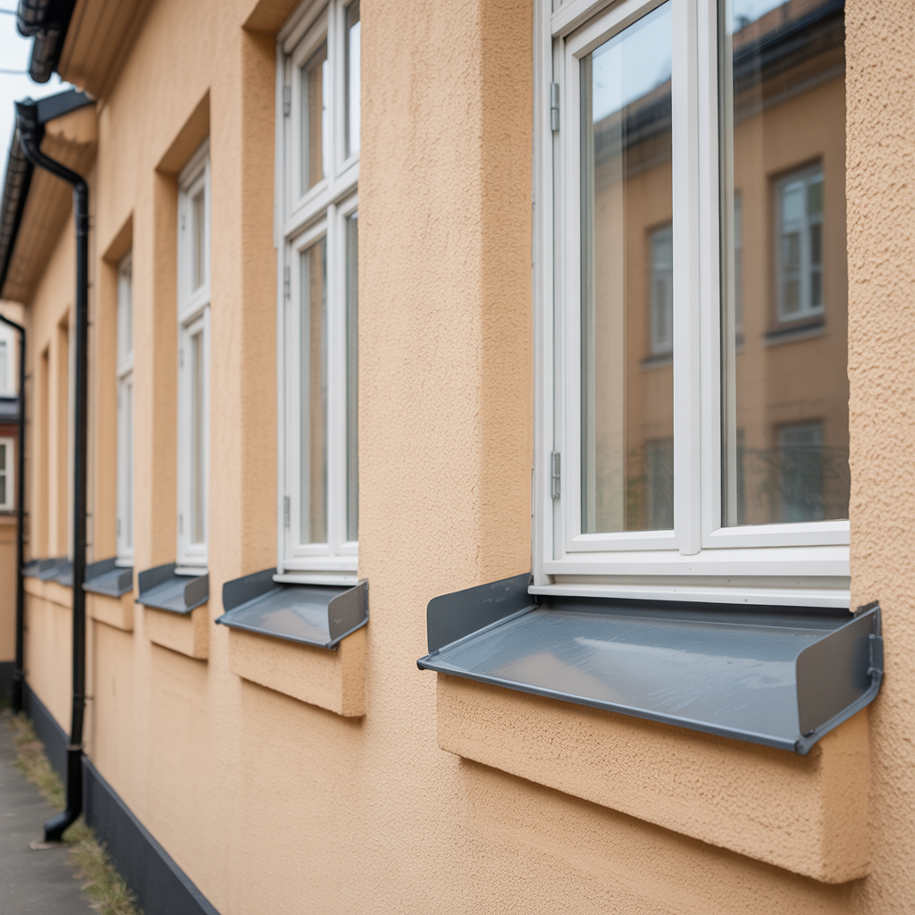 Demonteringen genomfördes etappvis under väderskydd, där bågar och karmar togs ned utan att skada intilliggande fasad. Montage av de nya fönstren utfördes med karmskruv och distanser, med löpande kontroll av lod, våg och diagonalmått för att säkra rätt funktion. Drevning utfördes med komprimerad foglist/mineralull och kompletterades med invändig ångtät tejp samt utvändig diffusionsöppen tätning för att kombinera lufttäthet med uttorkningsmöjlighet. Fogar avslutades med elastisk, åldersbeständig fogmassa mot smygar. Nya fönsterbleck i lackerad stålplåt monterades med korrekt fall från karm, uppvik i gavlar och tät anslutning mot droppnäsa. Sidbleck och anslutande plåt kompletterades vid behov för att säkerställa ett sammanhängande vattenavledande system. Samtliga infästningar försågs med tätbrickor, och skarvar tätades med butylband. Efter montage justerades beslagen och snäpplås/handtag provades för lätt gång.